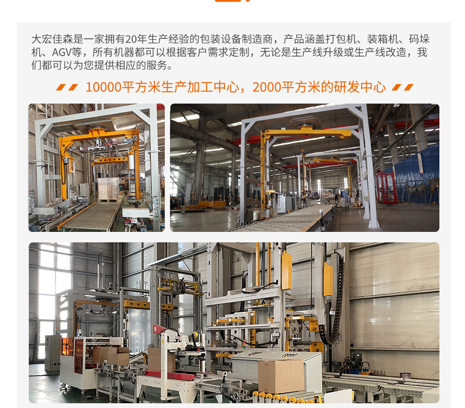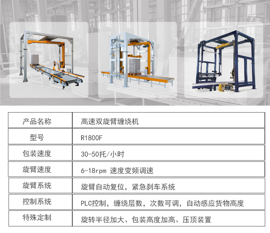 大宏佳森高速雙旋臂纏繞機R1800F主要適用于生產量大、包裝效率較高的現代化作業,包裝成本低、效率高滿足貨物的包裝要求。可根據不同的產品和現場的實際需求,定制不同的包裝系統,自動完成貨物的感測、包裝輸送等全過程,輸送系統可采用滾筒、鏈條、鏈板等不同的形式,自動上斷膜機構可實現無人化操作廣泛應用于食品、飲料、化工、造紙、建材等行業。