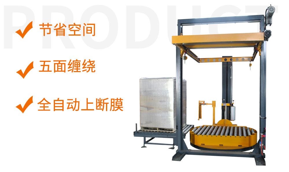 覆頂裝置自動啟動,通過升降機將膜降到貨物頂部,將塑料薄膜卷放在升降架的排膜輥上,排膜輥通過電機和鏈輪鏈條帶動旋轉,