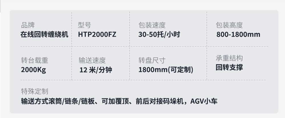 大宏佳森在線回轉(zhuǎn)纏繞機(jī)HTP2000FZ,主要適用于生產(chǎn)量大、物流效率較高的現(xiàn)代化作業(yè),滿足較輕或較重貨物的包裝要求。